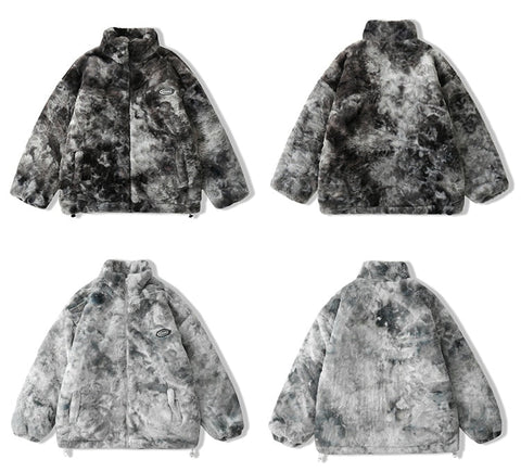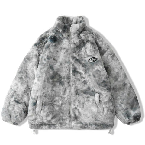 Faux Fur Fleece Winter Jacket Men Tie Dye Printed Fuzzy Jackets Casual Hip Hop Baggy Warm Zipper Coats Couple Outerwear